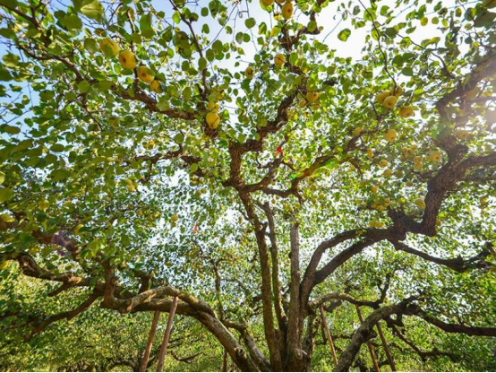 老家·观音岩内有千年的梨树栽培的历史,景区内有5棵古梨树,树龄150-200多年,盛产期年产量达3吨多,水分充足口感甜脆,品尝顿觉满口生津、唇齿溢香。其中更有一棵“千年梨树王”,这棵梨树高达10余米,树围达到2.17米,树冠覆盖面积逾百平方米。树上枝繁叶茂,生机勃勃,每逢梨树丰收,大家便三五相邀前来采摘,最好的光景,一年能产几千斤梨子,分为三层,越到上层,梨子的口感就越好越甜。