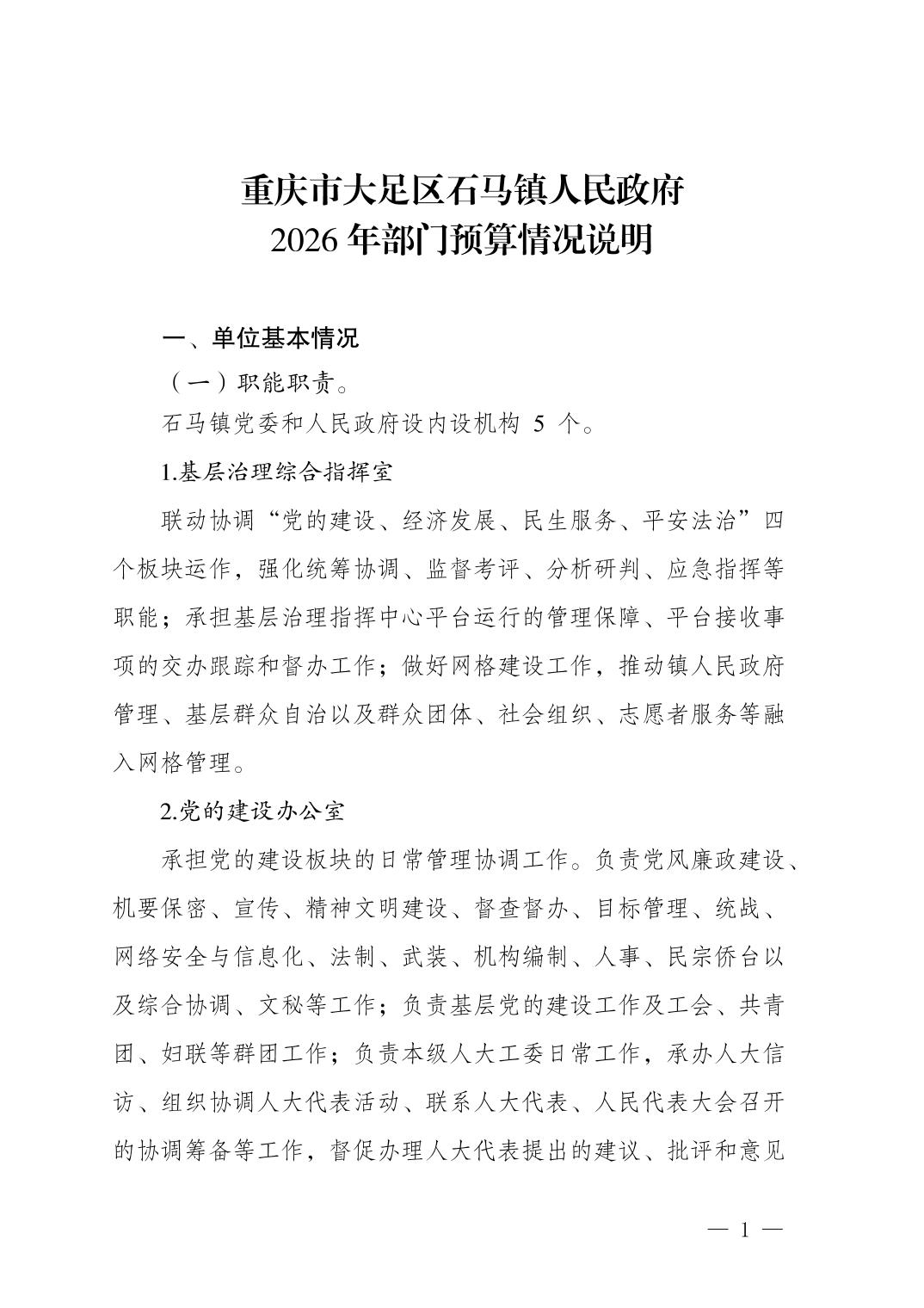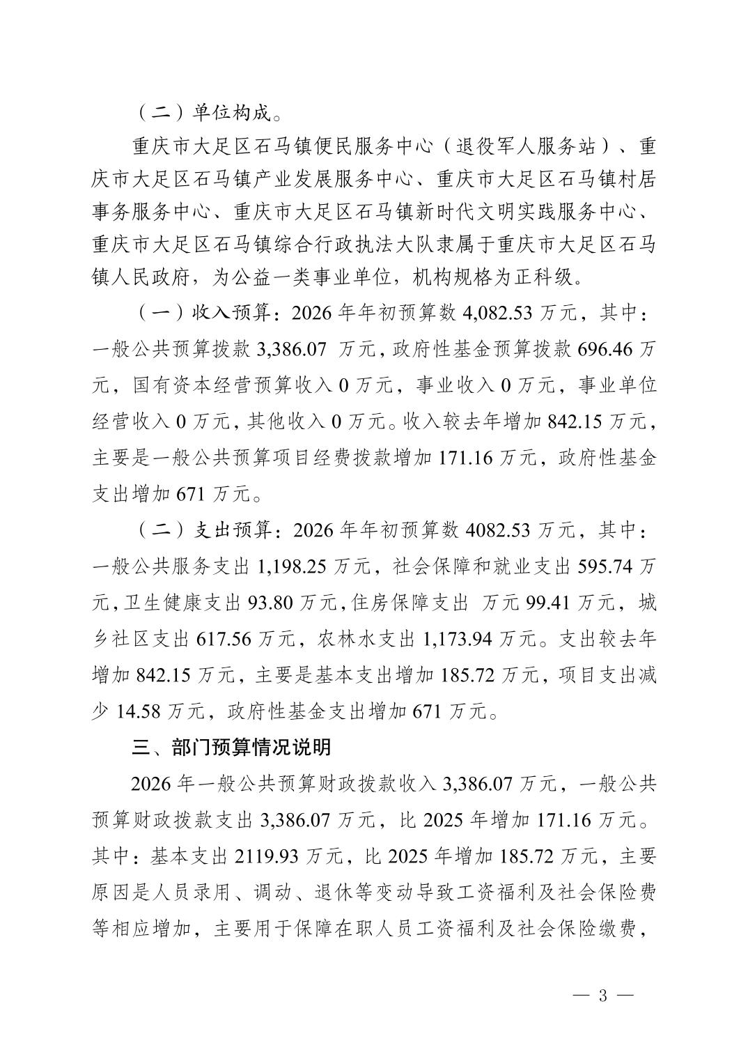 重庆市大足区石马镇人民政府2026年部门预算情况说明