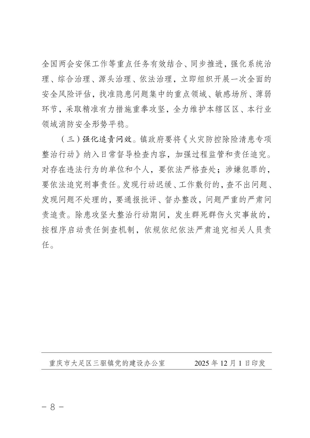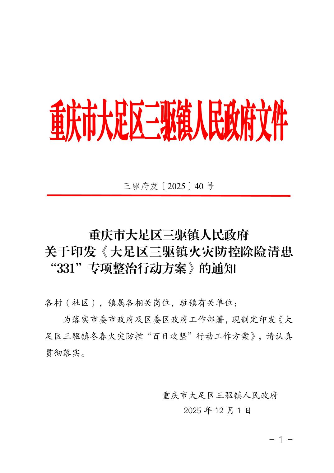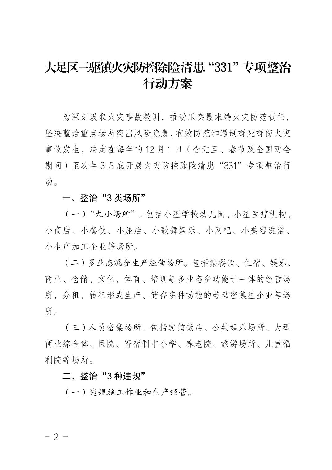 重庆市大足区三驱镇人民政府 关于印发《大足区三驱镇火灾防控除险清患“331”专项整治行动方案》的通知