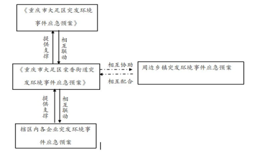 本预案为《重庆市大足区人民政府棠香街道办事处突发环境事件应急预案》,向下与棠香街道辖区内企业突发环境事件应急预案衔接,向上与《重庆市大足区突发环境事件应急预案》衔接。当棠香街道辖区内企业发生突发环境事件,企业预案不能应对时,启动本级预案,并向上级政府部门报告,上级政府部门应急预案启动后,棠香街道各应急处置队伍、设施、物资等由上级指挥机构调配,配合开展应急处置。