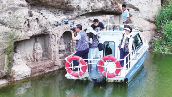 工作人员收集摩崖造像影像记录。