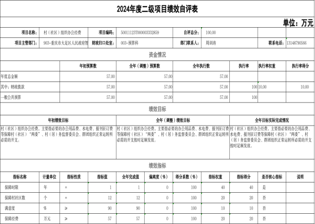 我单位对村(社区)组织办公经费开展了绩效评价,涉及财政拨款项目资金57万元,评价得分100分,评价等次为优秀,绩效评价发现了村(社区)组织办公经费发放不够及时等主要问题,提出加大村(社区)组织办公经费发放保障力度等下一步工作建议;
