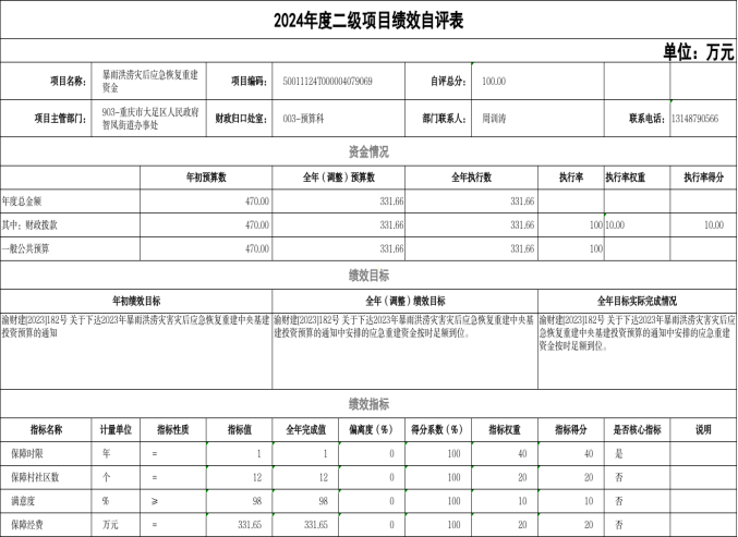 对暴雨洪涝灾后应急恢复重建资金开展了绩效评价,涉及财政拨款项目资金331.66万元,评价得分100分,评价等次为优秀,绩效评价发现了暴雨洪涝灾后应急恢复重建资金发放不够及时,资金因修复进度问题未全部发放等主要问题,提出下一步优化资金使用效率,保障灾后重建资金按期足额发放的工作建议。