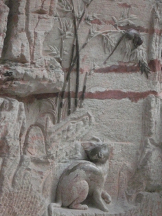 在《六道轮回图》的下方,还刻有一组耐人寻味的图像。图像中刻一丛弯曲的竹子,其中一枝竹茎上,一只老鼠攀附在竹梢上,其状畏畏缩缩。竹子的下方蹲坐着一只猫,猫翘首望着老鼠,其状伺机待赴。