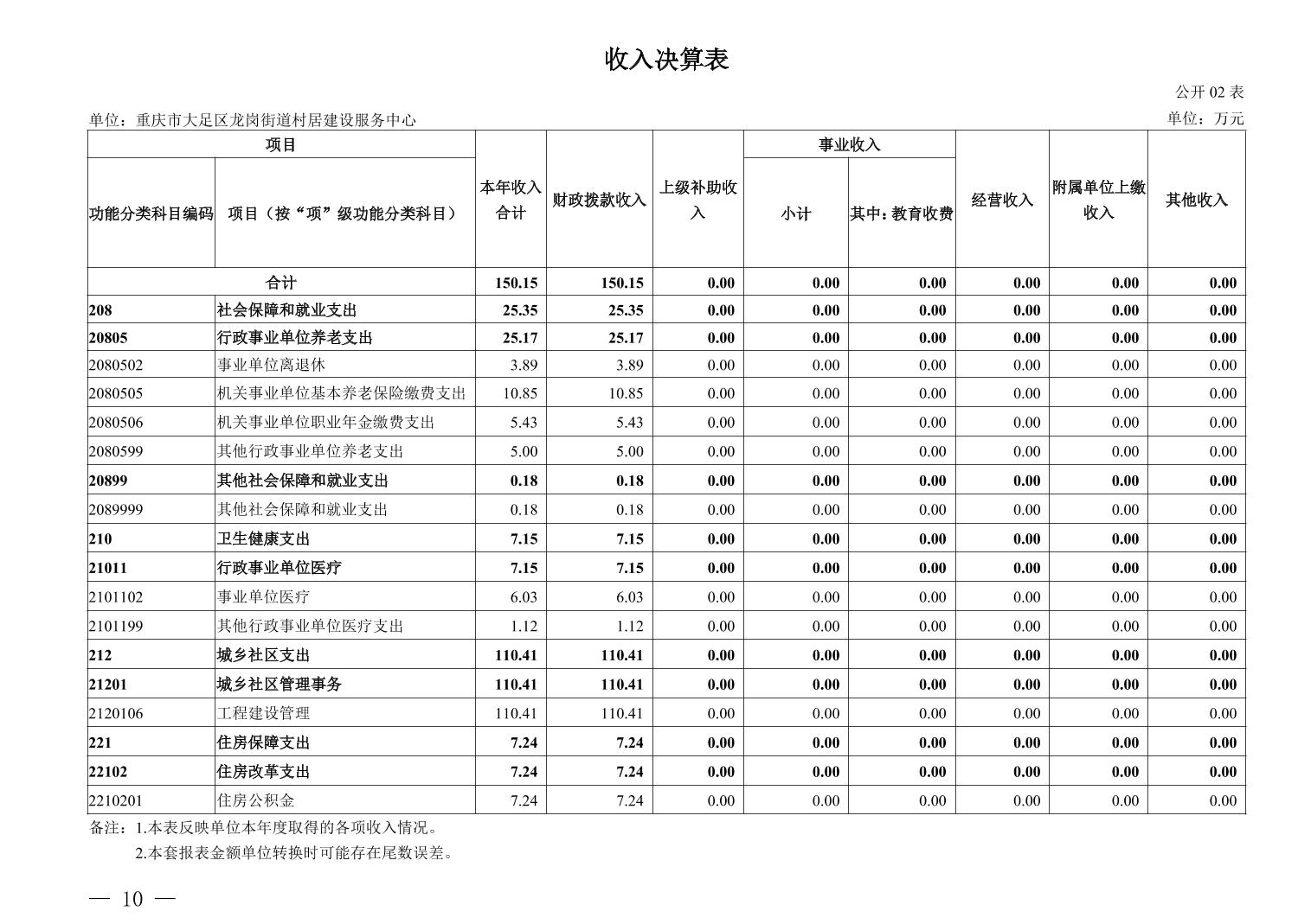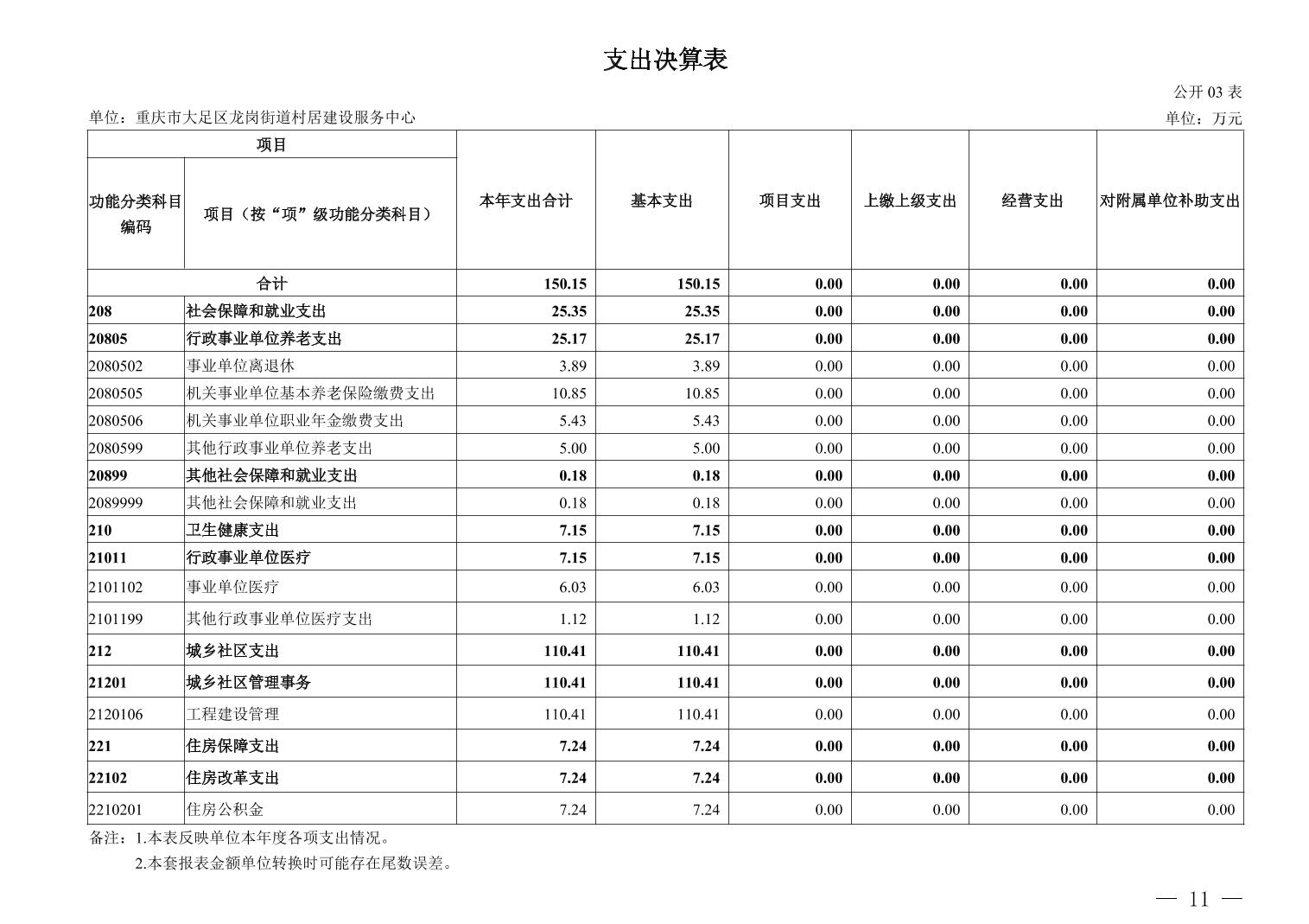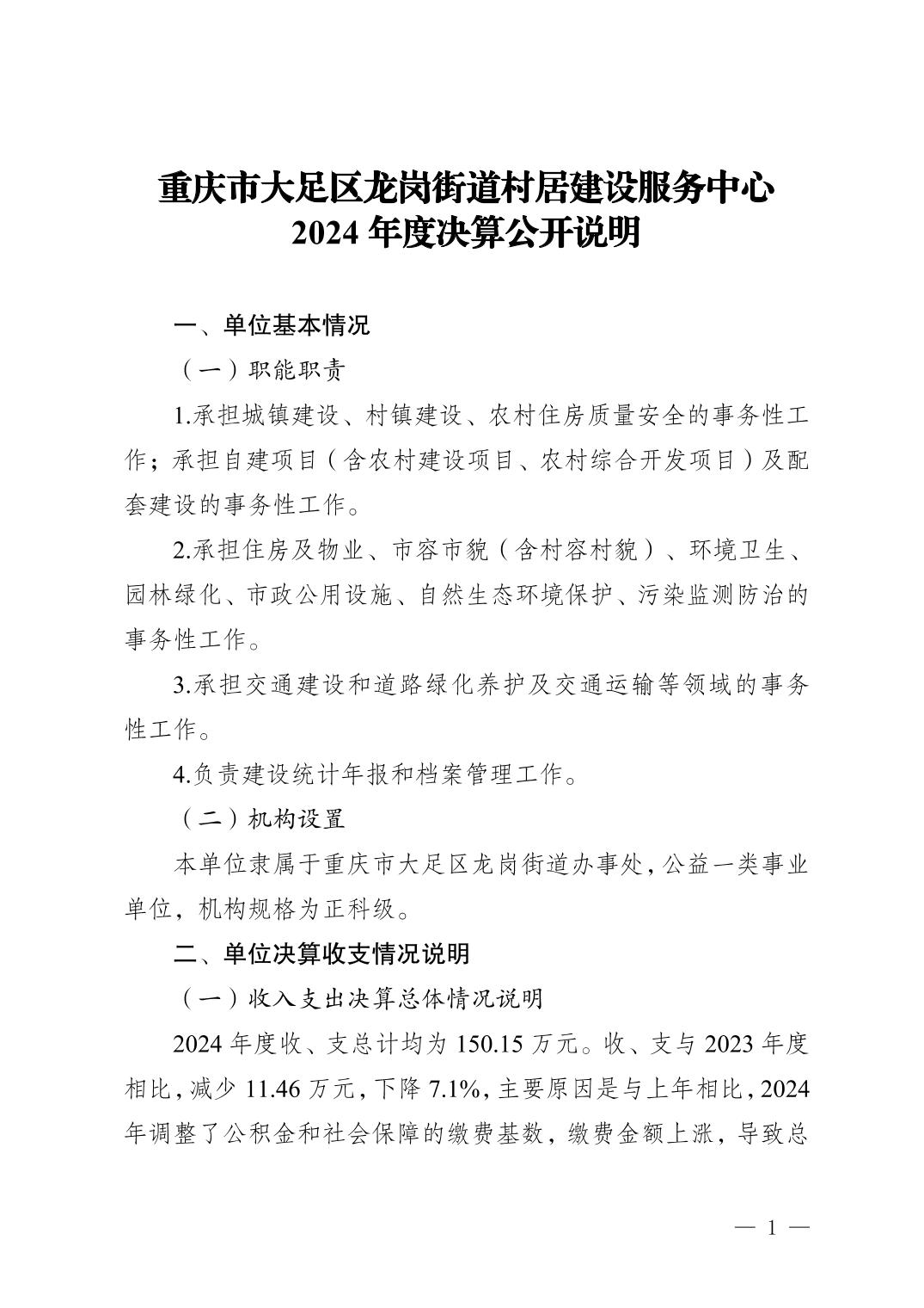 重庆市大足区龙岗街道村居建设服务中心_2024年决算公开说明及公开报表(单位)