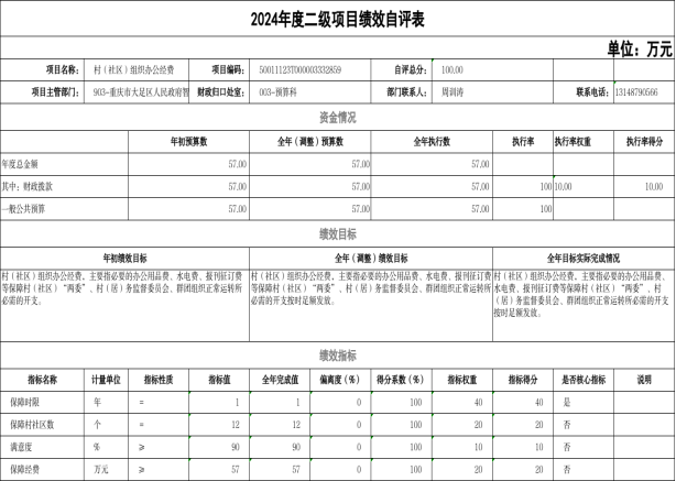 我单位对村(社区)组织办公经费开展了绩效评价,涉及财政拨款项目资金57万元,评价得分100分,评价等次为优秀,绩效评价发现了村(社区)组织办公经费发放不够及时等主要问题,提出加大村(社区)组织办公经费发放保障力度等下一步工作建议;
