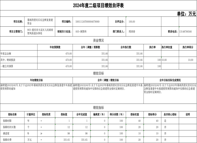 对暴雨洪涝灾后应急恢复重建资金开展了绩效评价,涉及财政拨款项目资金331.66万元,评价得分100分,评价等次为优秀,绩效评价发现了暴雨洪涝灾后应急恢复重建资金发放不够及时,资金因修复进度问题未全部发放等主要问题,提出下一步优化资金使用效率,保障灾后重建资金按期足额发放的工作建议。