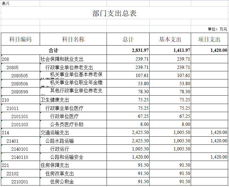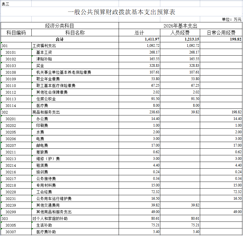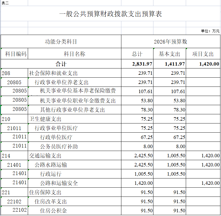 (二)支出预算:2026年年初预算数2831.97万元,其中:一般公共服务支出2831.97万元,教育支出0.00万元,社会保障和就业支出239.71万元,卫生健康支出75.25万元,住房保障支出91.5万元。支出较去年增加463.86万元,主要是基本支出增加259.54万元,项目支出增加204.32万元。
