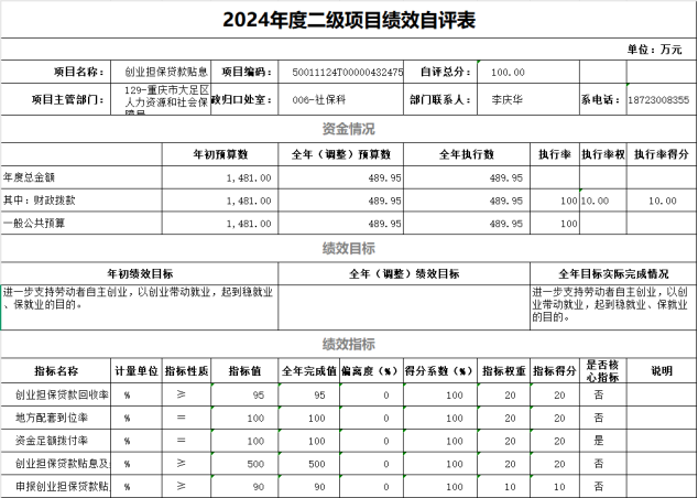 我单位对创业担保贷款贴息开展了绩效评价,涉及财政拨款项目资金489.95万元,评价得分100分,评价等次为“优”。