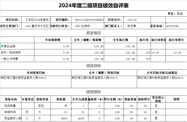 我单位对大足区脱贫人口跨区域交通补贴开展了绩效评价,涉及财政拨款项目资金101.42万元,评价得分100分,评价等次为“优”。