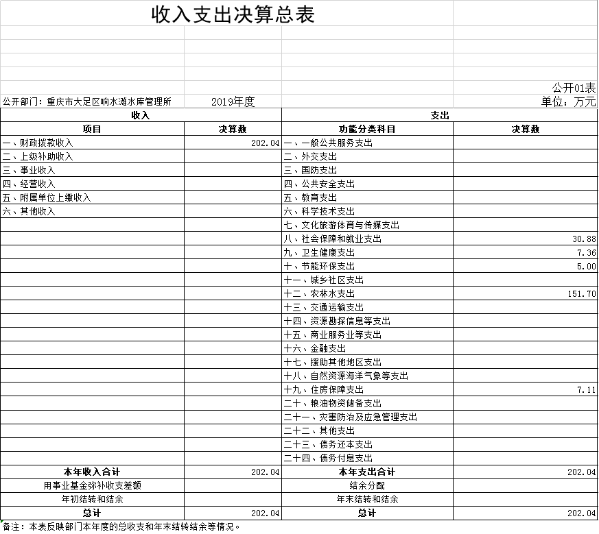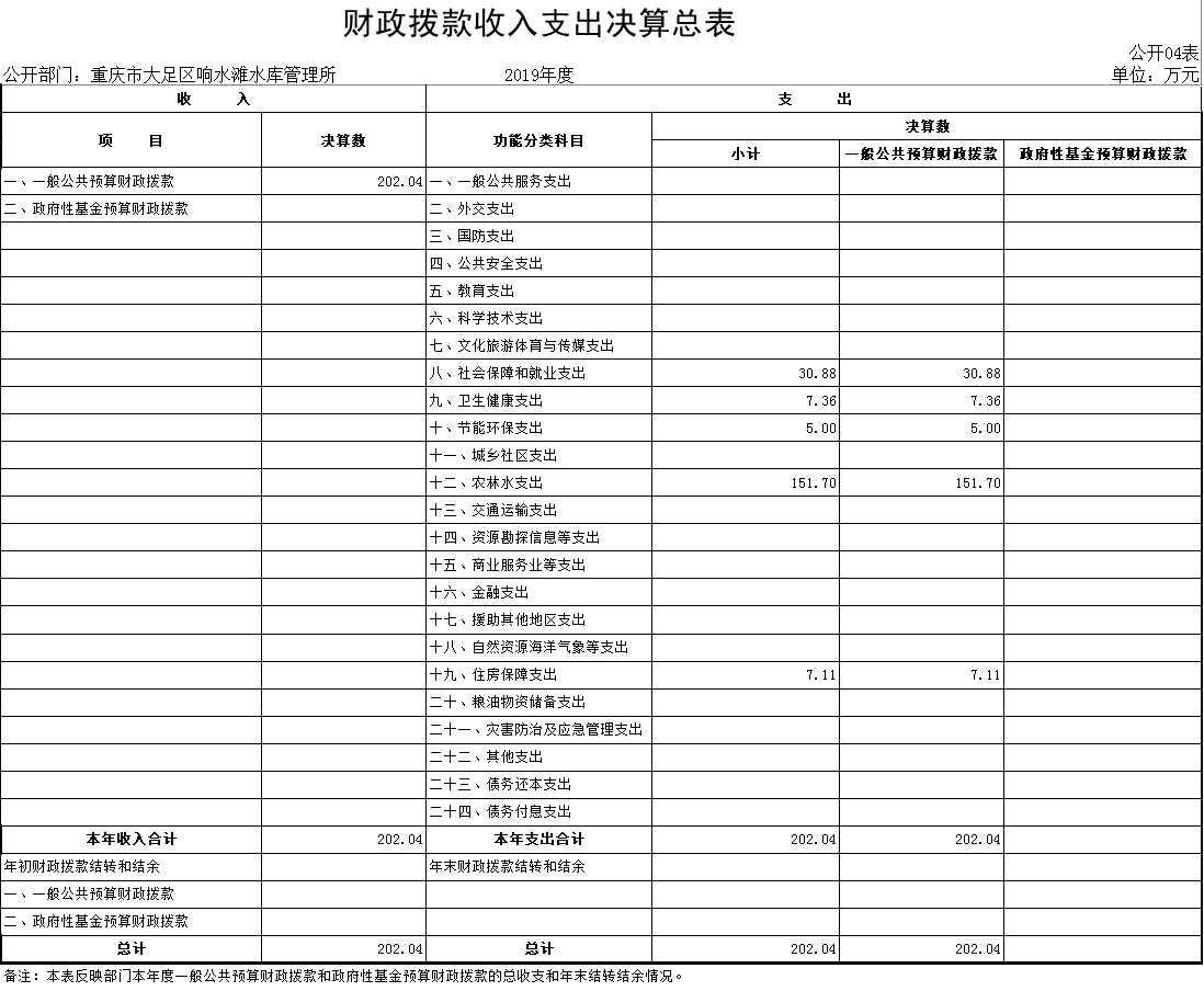 2019年度财政拨款收、支总计202.04万元。与2018年相比,财政拨款收、支总计各增加44.32万元,增长28.10%。主要原因是主要原因是职工工资调整、社保、医保、公积金等社会保障缴费支出增加,社保退休人员工资补差增加及库区综合整治支出。
