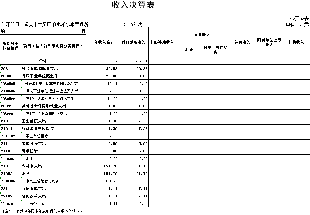 2.收入情况。2019年度收入合计202.04万元,较上年决算数增加44.32万元,增长28.10%,主要原因是主管部门基本工资、津贴补贴调整增加及社保、医保、公积金等社会保障缴费支出增加,社保退休人员工资补差增加及库区综合整治支出。。其中:财政拨款收入202.04万元,占100.00%;