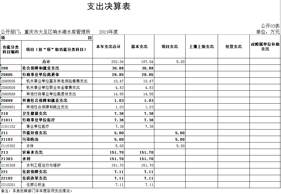 3.支出情况。2019年度支出合计202.04万元,较上年决算数增加44.32万元,增长28.10%,主要原因是职工基本工资、津贴补贴调整增加及社保、医保、公积金等社会保障缴费支出增加,社保退休人员工资补差增加及库区综合整治支出。其中:基本支出197.04万元,占97.53%;项目支出5.00万元,占2.47%;
