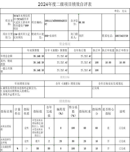 - 对2024年水利局项目—重庆市大足区上游水库等存量资产PPP项目开展了绩效评价,涉及财政拨款项目资金27,217.47万元,评价得分100分,评价等次为优。