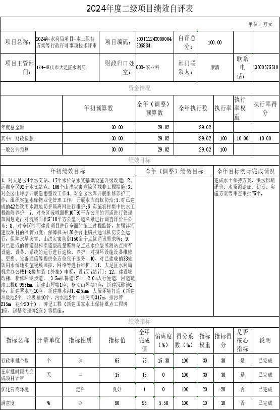- 对2024年水利局项目-水土保持方案等行政许可事项技术评审工程开展了绩效评价,涉及财政拨款项目资金29.02万元,评价得分100分,评价等次为优。