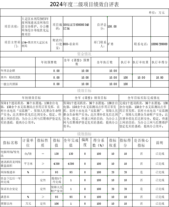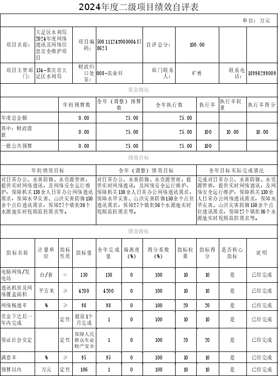 - 对大足区水利局2024年度网络通讯及网络信息安全维护5万元,评价得分100分,评价等次为优。