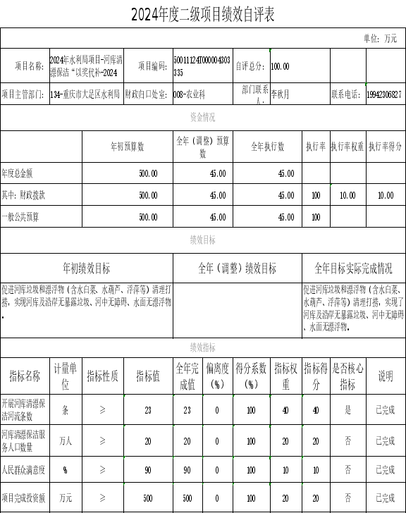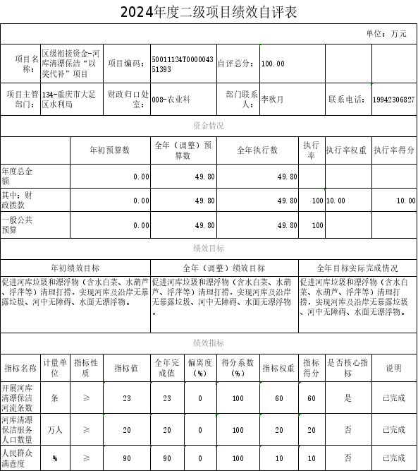 - 对2024年水利局项目—河库清漂保洁“以奖代补开展了绩效评价,涉及财政拨款项目资金4