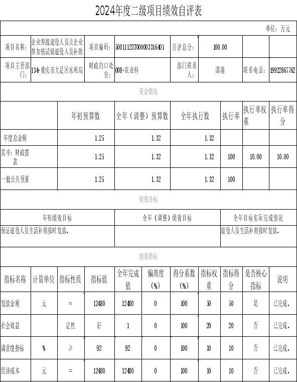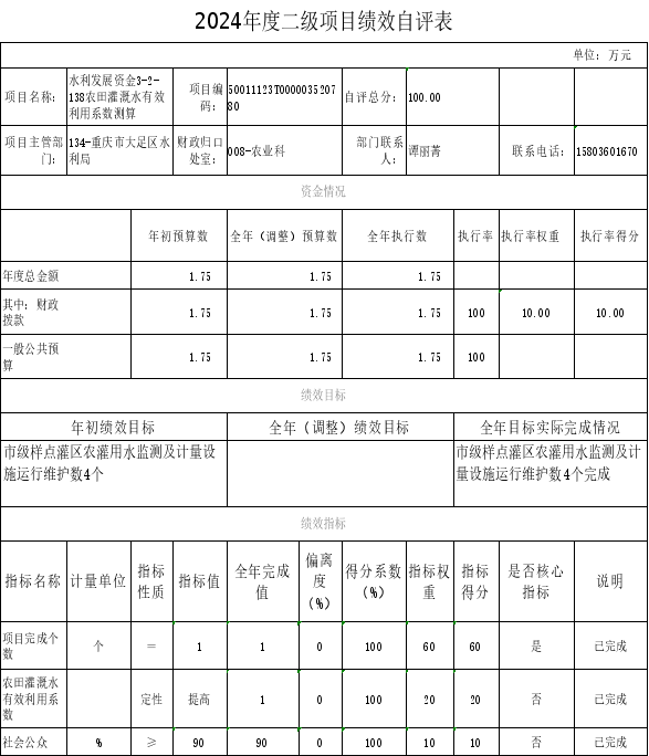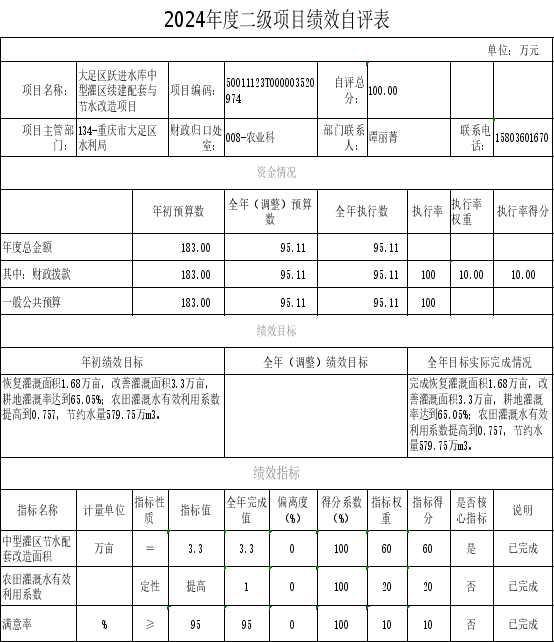 - 对大足区跃进水库中型灌区续建配套与节水改造项目开展了绩效评价,涉及财政拨款项目资金95.11万元,评价得分100分,评价等次为优。