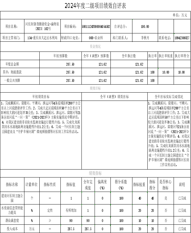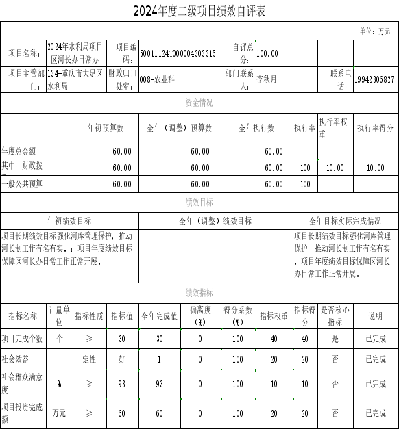 - 对区河长办日常办公经费开展了绩效评价,涉及财政拨款项目资金60万元,评价得分100分,评价等次为优,