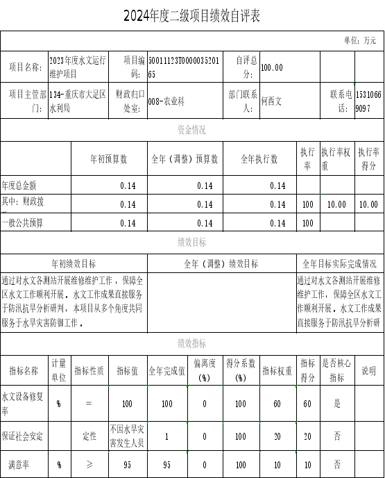 - 对2023年度水文运行维护项目开展了绩效评价,涉及财政拨款项目资金0.13