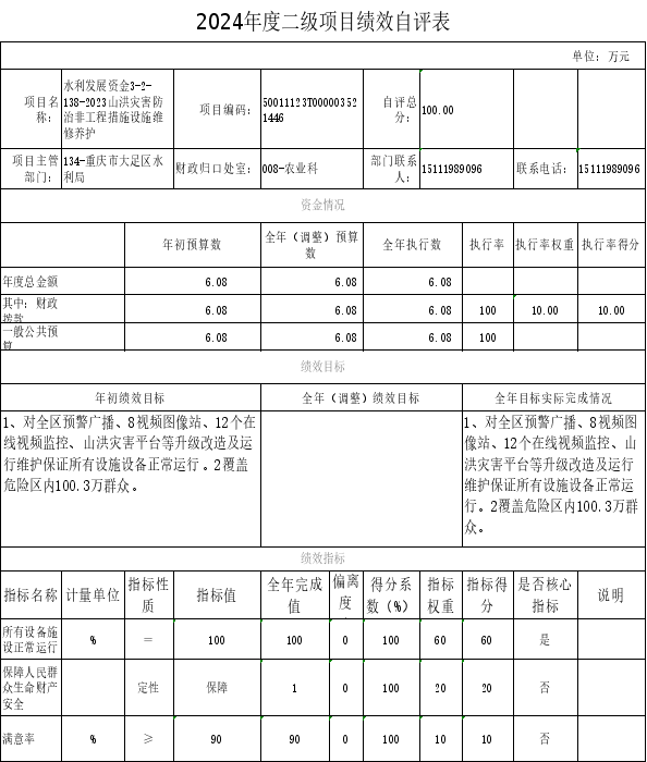 - 对2024年水利局项目山洪灾害防治非工程措施设施维修养护开展了绩效评价,涉及财政拨款项目资金6.0