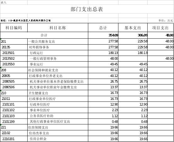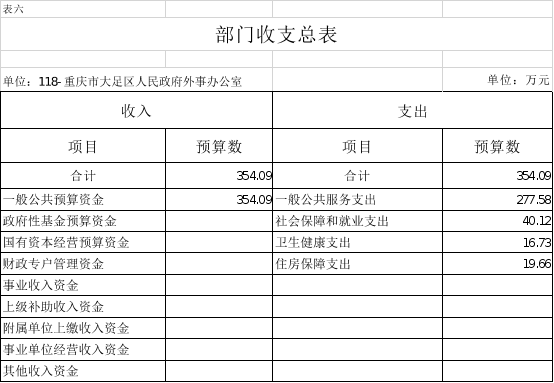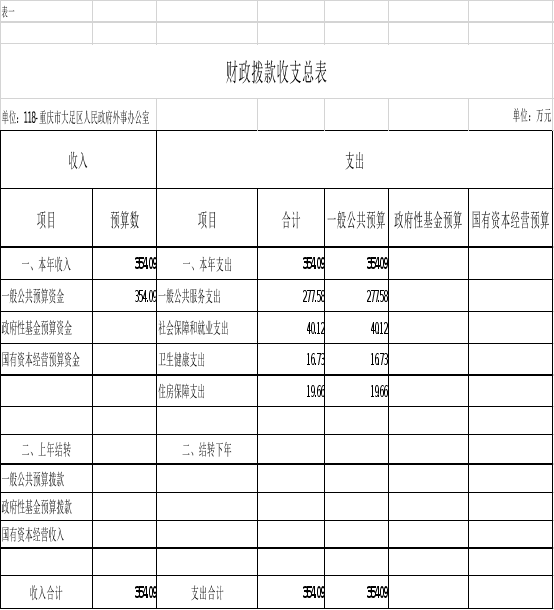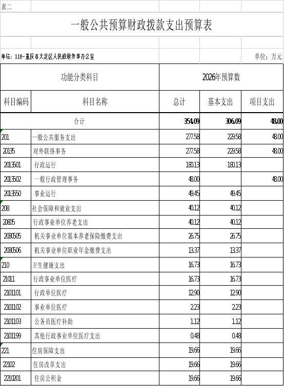 2026年一般公共预算财政拨款收入354.09万元,一般公共预算财政拨款支出354.09万元,比2026年减少63.76万元。其中:基本支出306.09万元,比2026年增加36.24万元,下属事业单位增加专业技术人员1名和部门其他职工职务职级晋升,主要用于保障区政府外办及区外事服务中心在职人员工资福利及社会保险缴费,保障部门正常运转的各项商品服务支出;项目支出48万元,比2026年减少100万元,主要原因是按照区委、区政府安排取消统筹管理大足区外事专项经费的归口项目,项目资金主要用于外事接待、涉外活动开展、友城建设、因公出访、外资招商、宣传培训等重点工作。