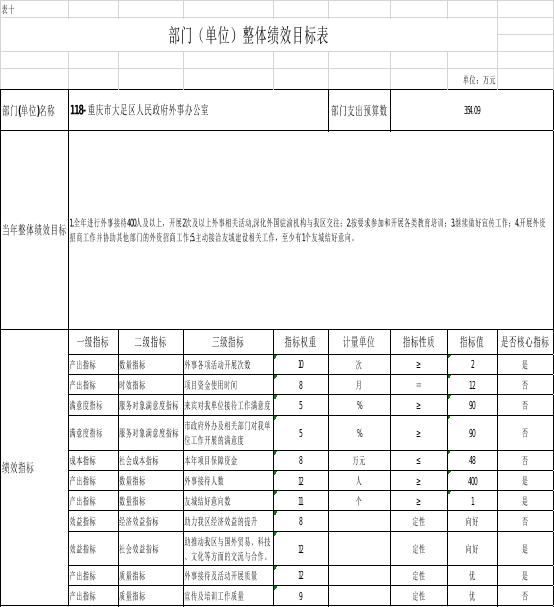 重庆市大足区人民政府外事办公室(一级预算单位);部门包括两个二级预算单位,分别是:行政单位重庆市大足区人民政府外事办公室(本级),公益一类事业单位重庆市大足区外事服务中心。行政单位重庆市大足区人民政府外事办公室内设秘书科、外事科两个科室,承担区委外办、区政府外办相关工作任务。正科级公益一类事业单位重庆市大足区外事服务中心,有事业编制4名,设主任1名,经批准可使用编制3名。目前部门共有工作人员12人,在编人员10名,派遣人员1名和志愿者1名。