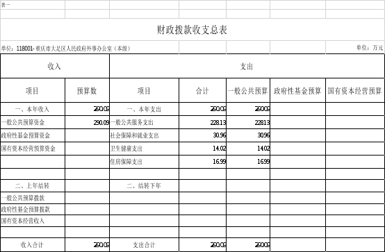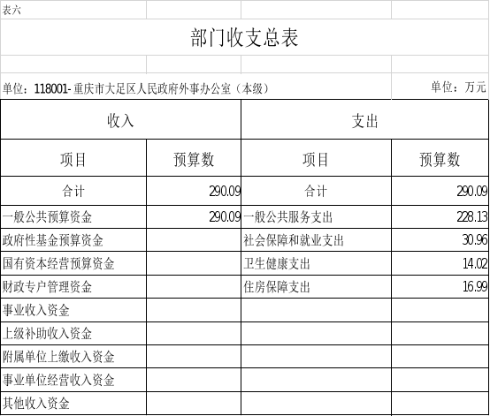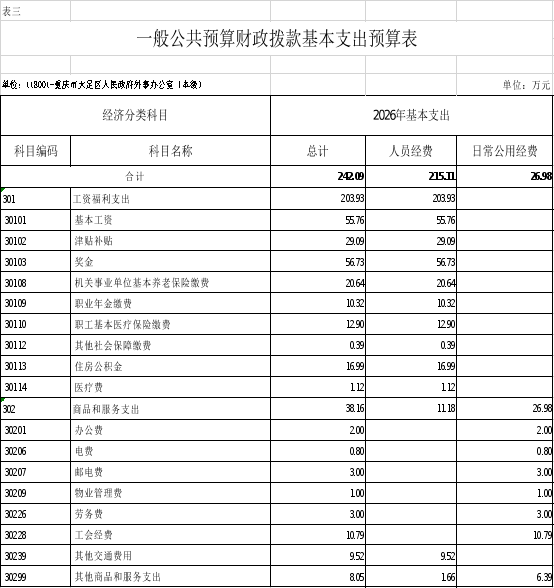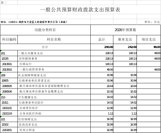 2026年一般公共预算财政拨款收入290.09万元,一般公共预算财政拨款支出290.09万元,比2025年减少85.23万元。其中:基本支出242.09万元,比2025年增加14.77万元,主要原因是人员正常职级晋升,医疗保险和社会保险等基数调标,因此所需的工资预算和养老保险、职业年金、医疗保险、住房公积金等都相应的上升,基本支出主要用于保障本单位所有在职人员工资福利及社会保险缴费等,保障单位正常运转的各项商品服务支出;项目支出48万元,比2025年减少100万元,主要原因是按照区委、区政府安排取消统筹管理大足区外事专项经费的归口项目,项目资金主要用于外事接待、涉外活动开展、友城建设、因公出访、外资招商、宣传培训等重点工作。