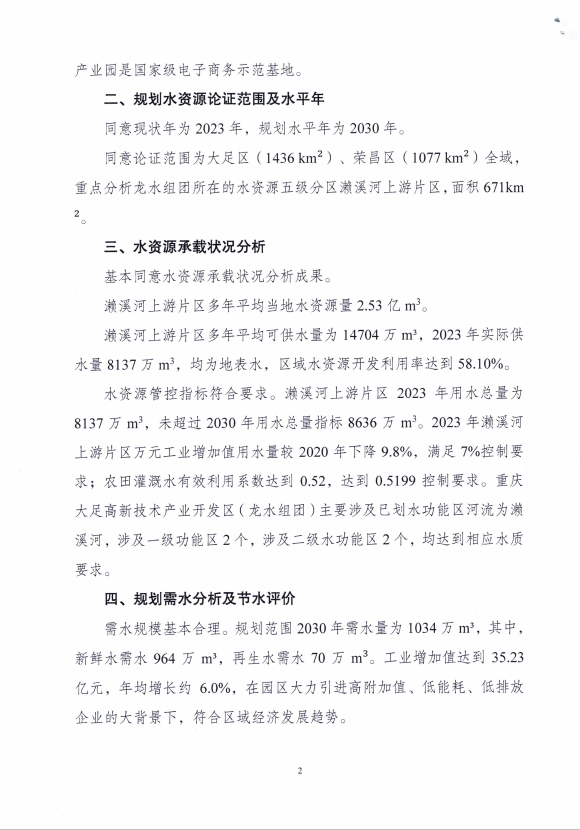 基本同意《报告》主要内容。规划水平年为2030年;2030年工业园区需水量1034万m³,小于大足区2030年用水总量控制指标31159万m³,小于大足区濑溪河上游片区水资源五级区用水总量控制指标8635万m³,基本符合用水总量指标管控要求;2030年万元工业增加值用水量控制在3.75m³/万元,城镇供水管网漏损率控制在8.5%以内,基本符合节水目标管控要求;2030年工业园区供水水厂为双路镇水厂,水源为玉滩水库、十里沟水库以及渝西水资源配置工程,其中玉滩水库供水716万m3,十里沟水库供水38万m3,渝西水资源配置工程供水210万m3,再生水供应70万m3。水资源配置方案基本合理。
