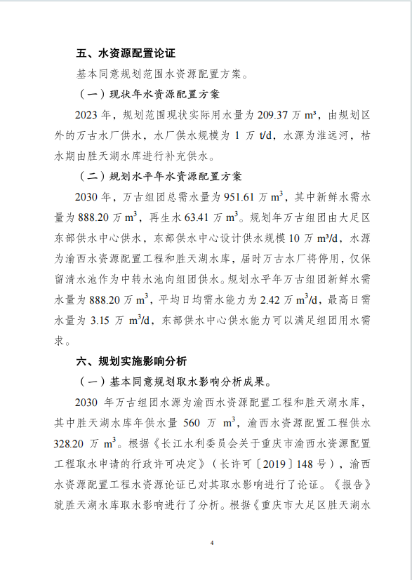基本同意《报告》主要内容。规划水平年为2030年;2030年万古组团需水量951.61万m³,小于大足区2030年用水总量控制指标31159万m³,小于大足区淮远河片区水资源五级区用水总量控制指标9586万m³,基本符合用水总量指标管控要求;2030年万元工业增加值用水量控制在3.5m³/万元,城镇供水管网漏损率控制在8.5%以内,基本符合节水目标管控要求;2030年万古组团由东部供水中心供水,水源为渝西水资源配置工程和胜天湖水库,其中胜天湖水库年供水量560.00万m³,渝西水资源配置工程供水量328.20万m³,再生水供水量63.41万m³,水资源配置方案基本合理。