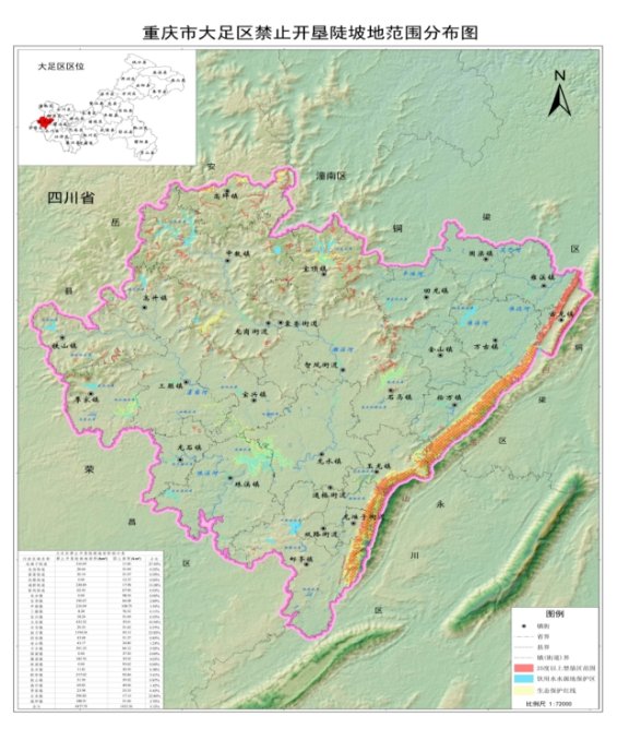 为贯彻落实中共中央办公厅、国务院办公厅《关于加强新时代水土保持工作的意见》和市委办公厅、市政府办公厅《重庆市贯彻落实〈关于加强新时代水土保持工作的意见〉具体措施》等有关要求,依据《中华人民共和国水土保持法》《重庆市实施〈中华人民共和国水土保持法〉办法》《禁止开垦陡坡地范围划定技术指南》等,遵循科学划定、落地准确、边界清晰、便于管理的原则,采用定量判别为主、定性判定为辅的方法,在优先保障耕地保护红线和耕地恢复补充空间的基础上开展了大足区禁止开垦陡坡地范围划定工作。现将大足区划定范围公告如下。
