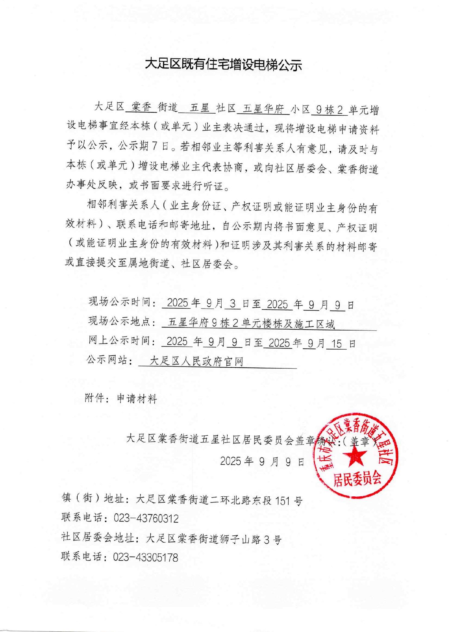 大足区既有住宅增设电梯公示(五星华府9栋2单元)