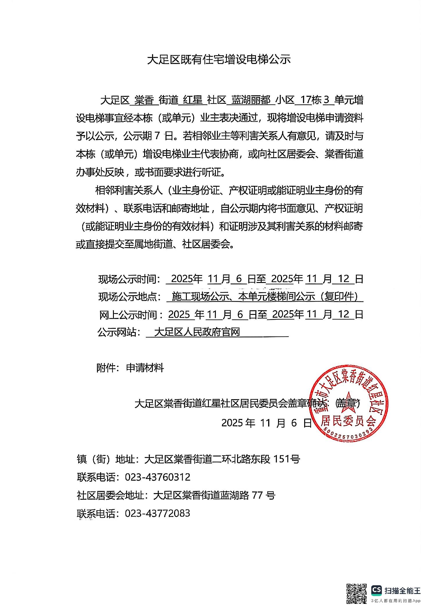 大足区既有住宅增设电梯公示(蓝湖丽都17-3单元)