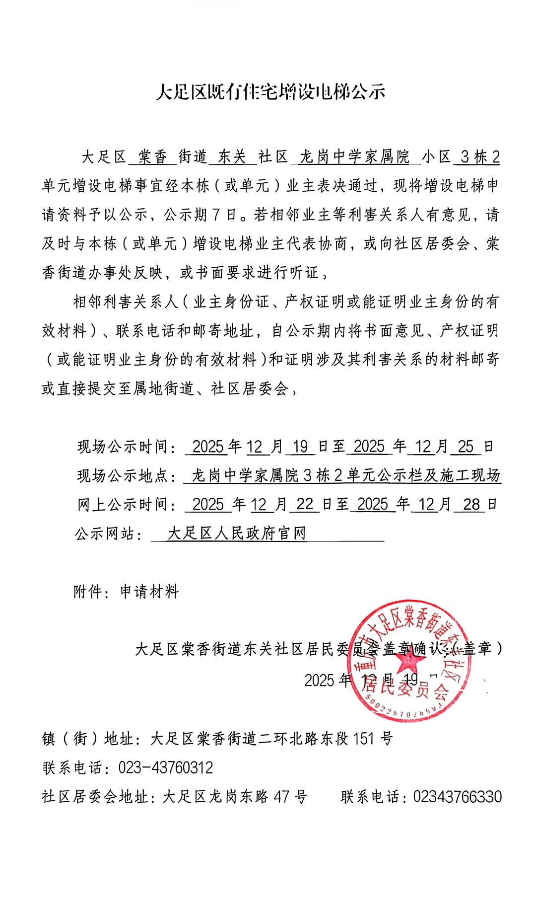 大足区既有住宅增设电梯公示(龙岗中学家属院小区3栋2单元)