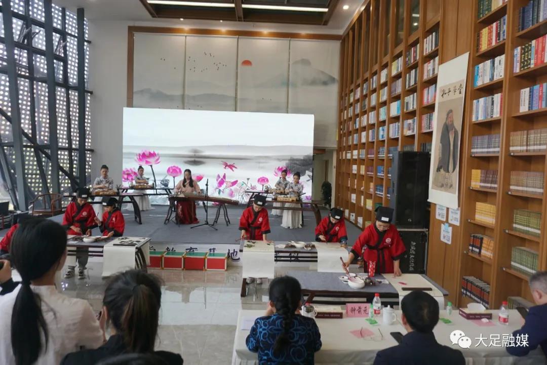 授牌仪式后,大足孔子学堂教育基地开笔启智礼随即举行。原大足石刻艺术博物馆馆长郭相颖受邀作为师尊长者代表,在一众孩童额头上进行朱砂点印,寓意开蒙启智。郭相颖寄语孩童珍惜光阴读书明理,做个杰出有用的人。孩童们点头应允,随之集体诵读《千字文》,学习国学经典。开笔仪式结束后,青少年带来传统茶艺展示,带领观众识茶礼、学茶艺、品茶香,让观众深切体会到中华茶文化的独特魅力。