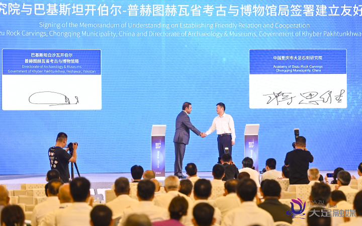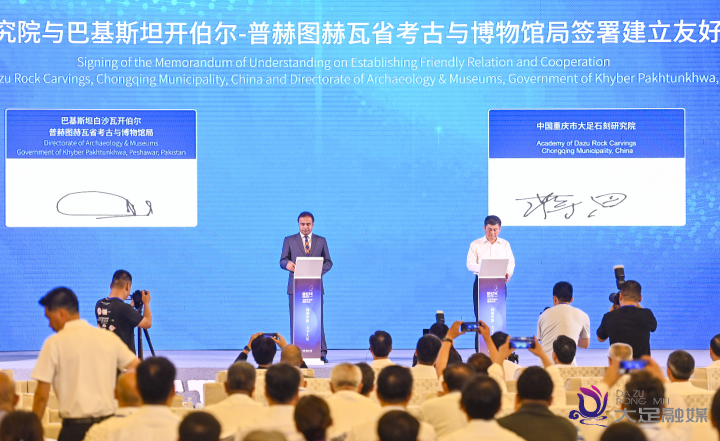 8月19日下午,首届石窟寺保护国际论坛开幕式上,大足石刻研究院与巴基斯坦开伯尔-普赫图赫瓦省考古与博物馆局签订建立友好合作关系谅解备忘录。未来,双方将采取不同类型、不同措施、不同形式、不同层次的合作方式,在文物保护、利用和管理等方面开展多领域、多层面的合作与交流。