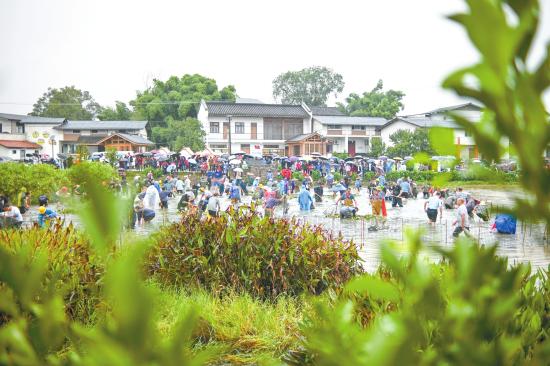 开幕式后,景区内多个特色活动区域同步开放,市民游客纷纷参与其中,感受丰收节的独特魅力。在农趣运动会现场,各类充满农耕特色的项目依次展开,让参与者沉浸式感受丰收的乐趣与农耕的意义。“扁担挑金秋”项目中,参赛者肩挑装满南瓜的竹筐,沿着“S”形赛道稳步前行,既考验平衡能力,又让人体会到农耕劳作的辛劳;“稻间捉鱼”区域更是热闹非凡,游客赤脚入田、徒手捉鱼,大人小孩都玩得不亦乐乎;“五谷丰登”创意贴画、柚子保龄球、欢乐套圈等项目也人气爆棚,参与者在游戏中不仅收获了趣味,更加深了对农耕文化的认知。