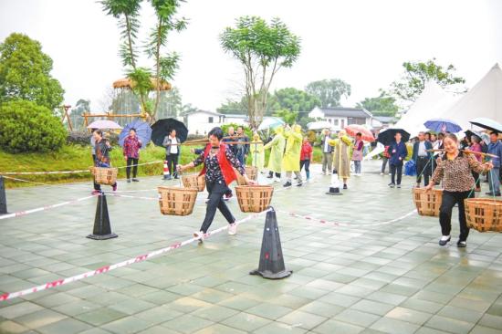“扁担挑金秋”比赛现场,参赛者肩挑南瓜竹筐,沿着“S”形赛道比赛。