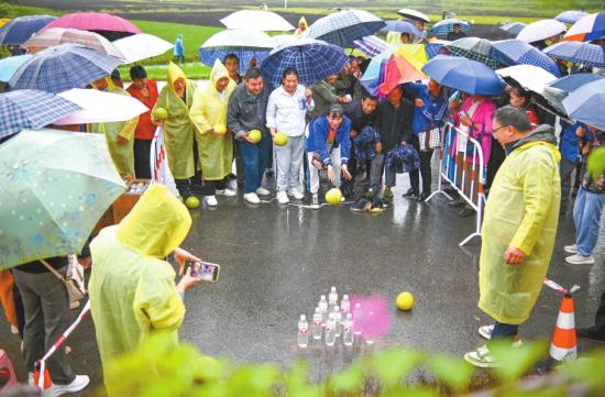 金黄的柚子当“保龄球”,游客们攥着柚子弓腰瞄准水瓶。