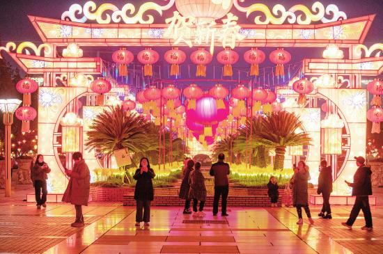 1月4日晚,大足城区宏声文化广场迎春灯饰光彩夺目,送来了浓浓的年味,吸引了不少市民观赏、拍照。