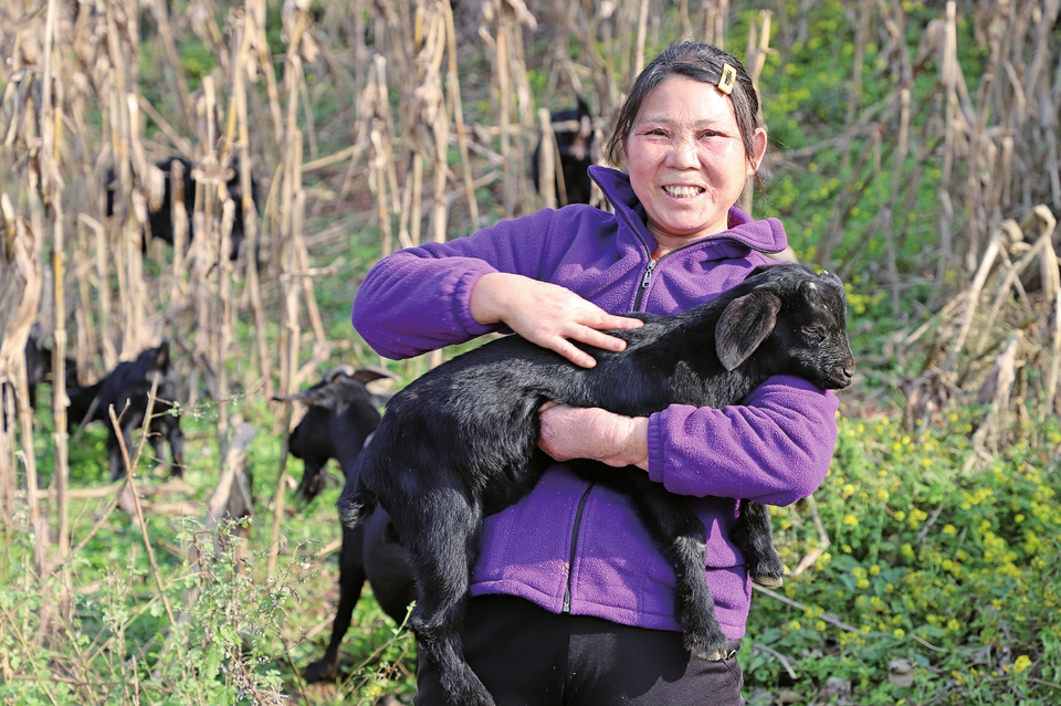 季家镇柏杨村村民唐吉容和她养殖的黑山羊。