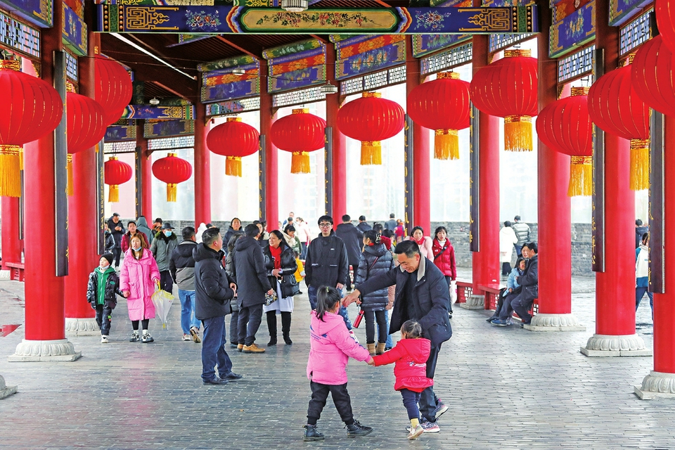 2月2日,香国公园帝师桥上,不少市民带家人一起享受假日美好时光。