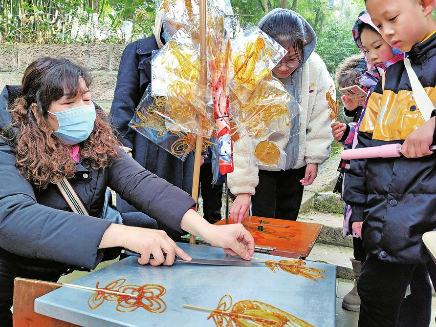 2月1日,市民在北山公园入口处买糖画。
