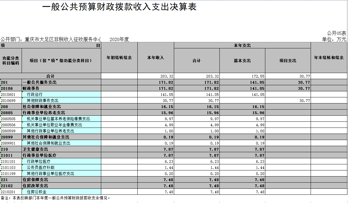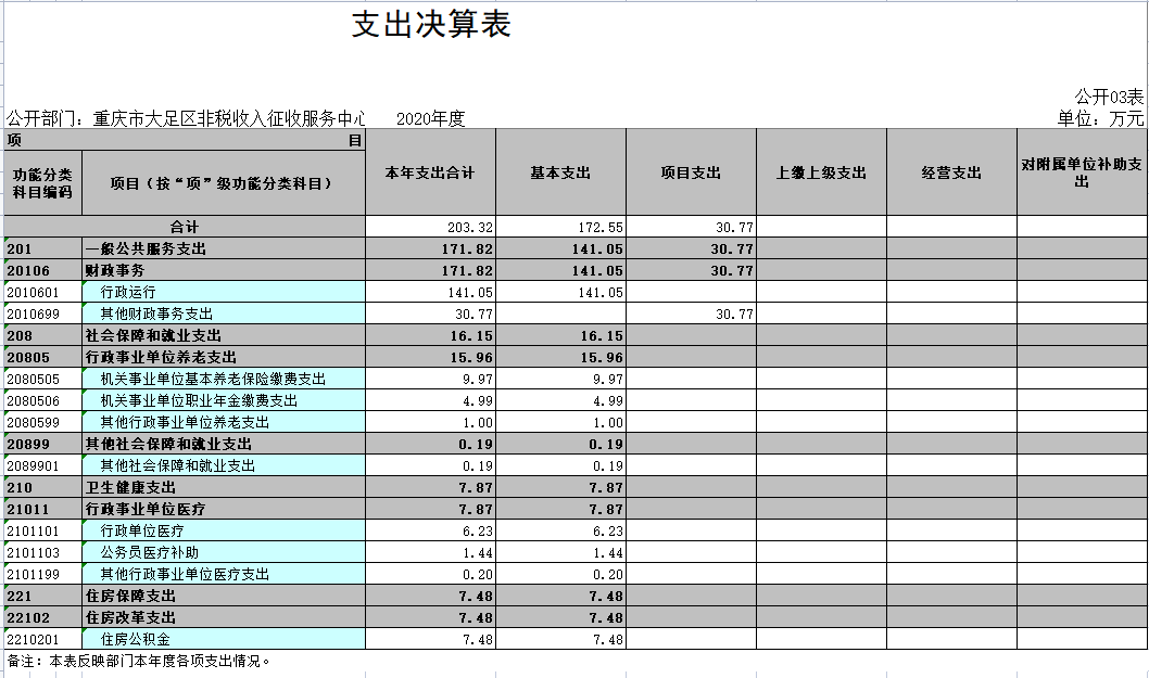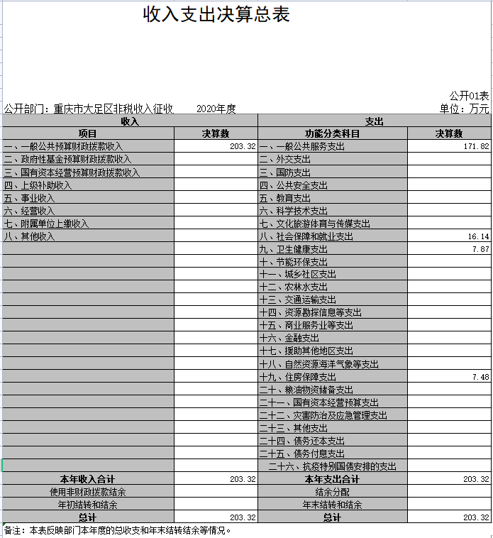 1.总体情况。2020年度收入总计203.32万元,支出总计203.32万元。收支较上年决算数 减少96.54万元、 下降 32.2%,主要原因是部分人员经费未列支(如年终一次性奖金、应休未休公休假报酬等),项目经费减少,软件系统维护费及票据工本费等项目支出减少。
