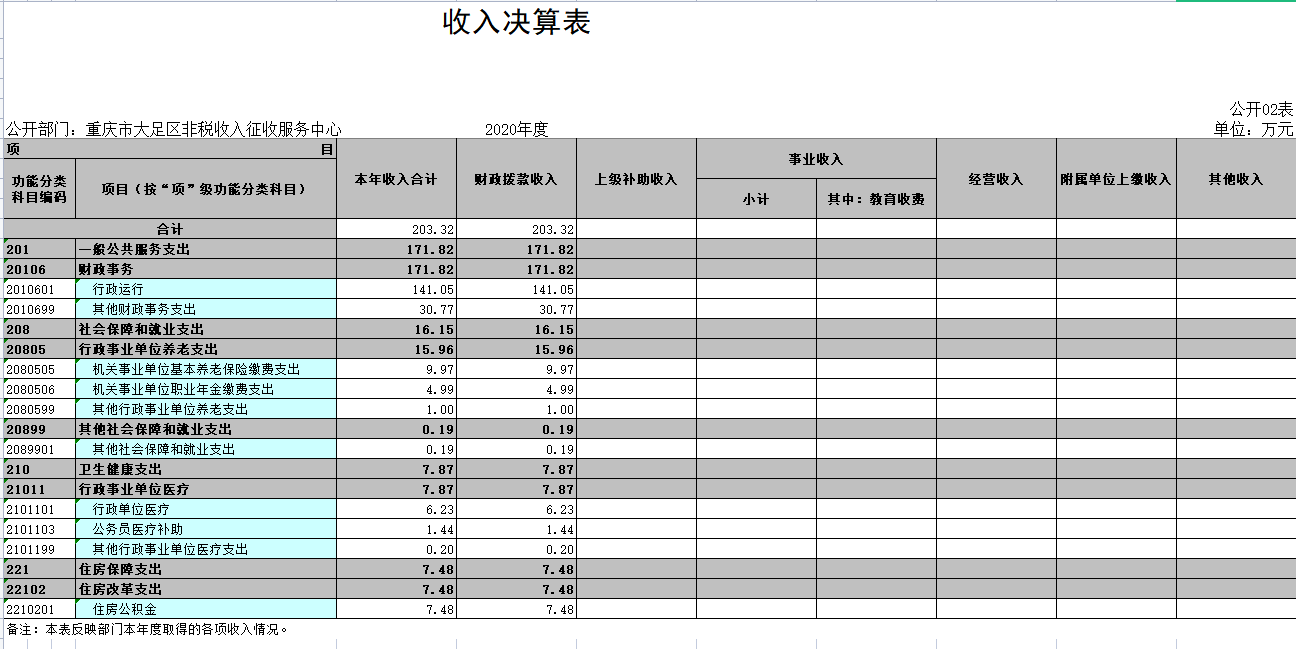 2.收入情况。2020年度收入合计203.32万元,较上年决算数减少96.54万元,下降32.2%,主要原因是项目经费减少,软件系统维护费及票据工本费等项目收入减少。其中:财政拨款收入203.32万元,占100。