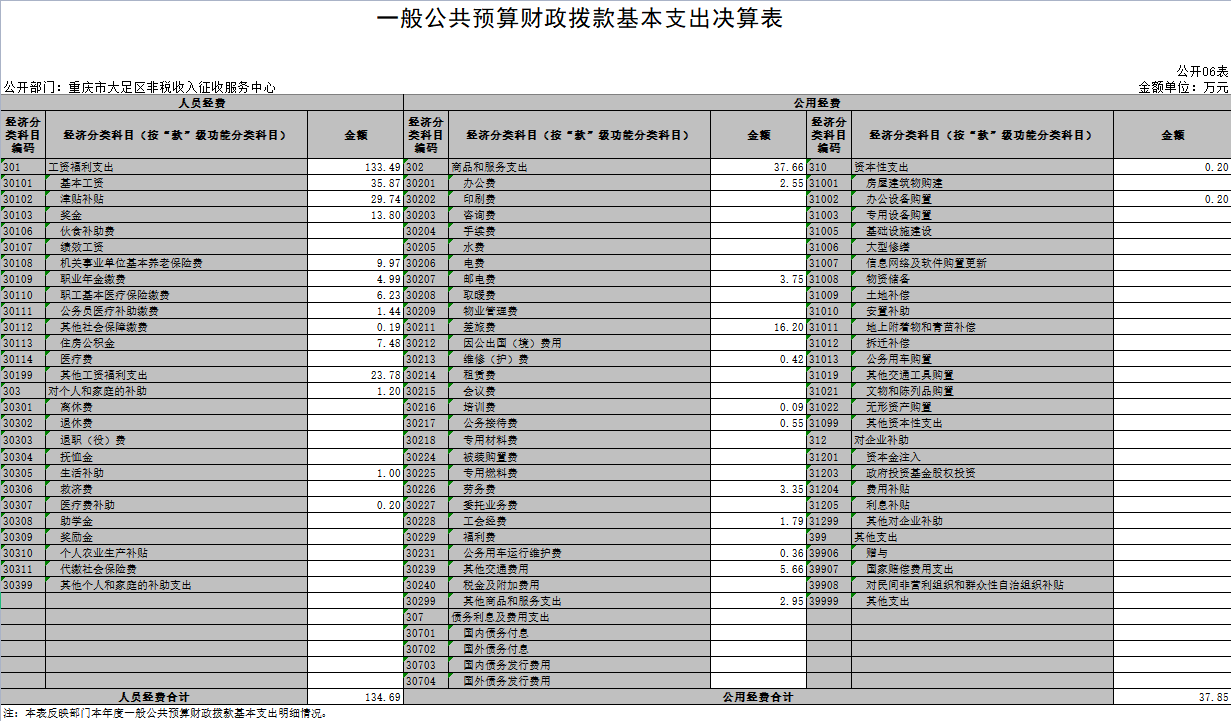 2020年度一般公共财政拨款基本支出172.55万元。其中:人员经费134.69万元,较上年决算数减少20.00万 元,下降12.9%,主要原因是部分人员经费未列支(如年终一次性奖金、应休未休公休假报酬等),项目经费减少,软件系统维护费及票据工本费等项目收支减少。人员经费用途主要包括职工工资福利支出。公用经费37.85万元,较上年决算数减少22.48万元,下降37.3%,主要原因是创建节约型机关,相关办公经费减少。公用经费用途主要包括购买办公设备、办公用品等,且满足单位政府采购相关需求。
