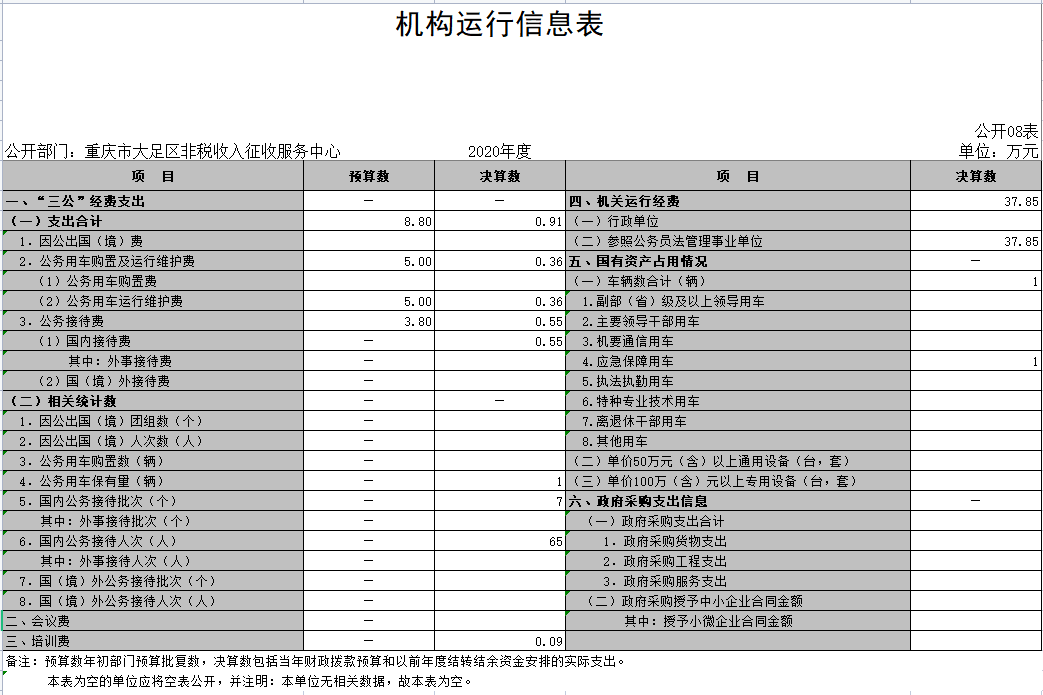 2020年度本部门因公出国(境)共计0个团组,0人;公务用车购置0辆,公务车保有量为1辆;国内公务接待7批次65人,其中:国内外 事接待0批次,0人;国(境)外公务接待0批次,0人。2020年本部门人均接待费84.38元,车均购置费0.00万元,车均维护费0.36万元。