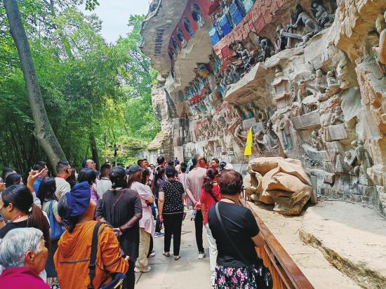 5月14日上午,大足石刻宝顶山景区游人如织。尽管“五一”黄金周已结束,但游客到大足石刻的游玩热度依旧不减。