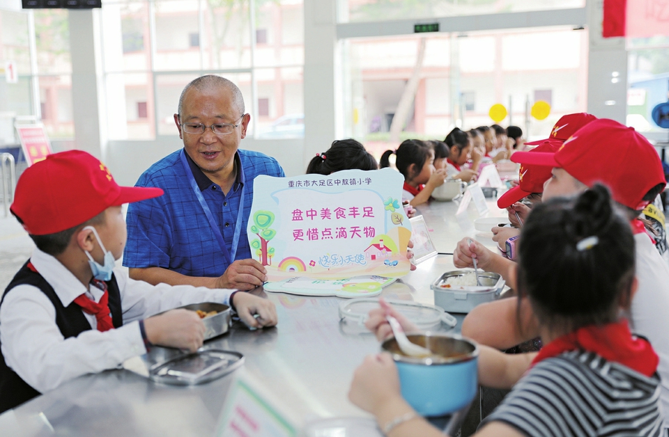 区纪委监委驻区教委纪检监察组副组长周正发向孩子们讲解拒绝餐饮浪费的相关知识