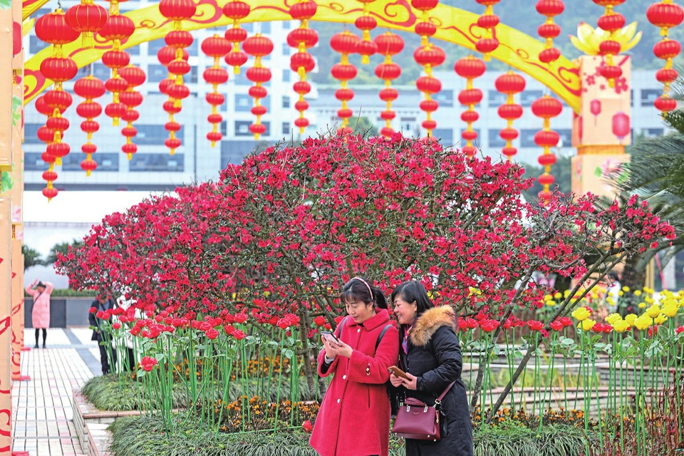 2月4日立春,宏声文化广场的海棠花开得正艳,吸引过往市民拍照留念。
